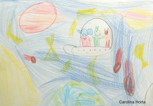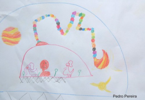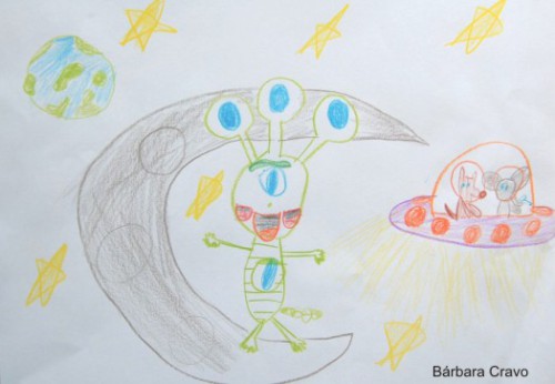 Eles foram num foguetão à Lua. Lá encontraram um extraterrestre. O nome dele era Lunar. Ele perguntou: