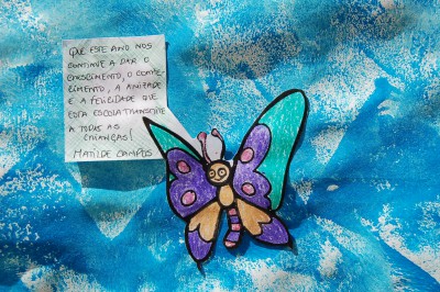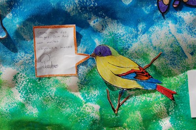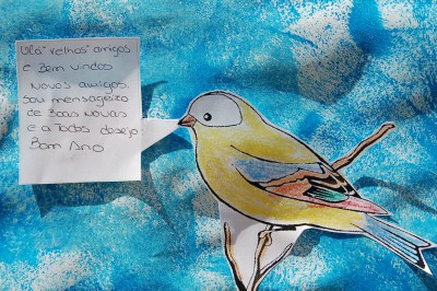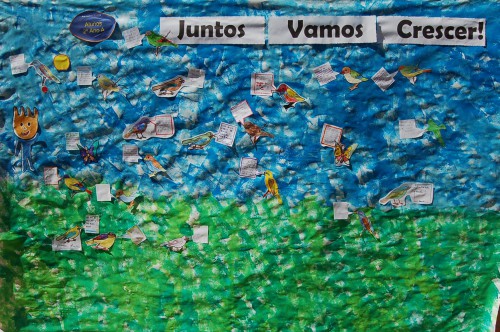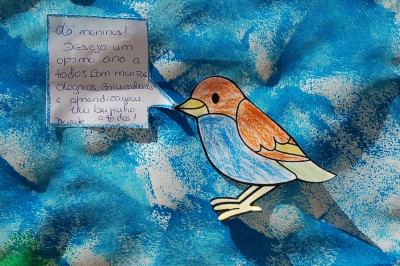 Para começar bem o ano letivo, à semelhança do ano passado, fizemos uma atividade simples que consistia em escolher uma ave, pintá-la, recortá-la, escrever uma mensagem e colá-la no "Jardim da nossa turma" que tinha como título: Juntos vamos Crescer!.